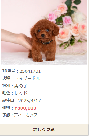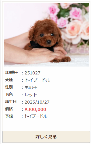 | 一般的なトイプードル | 20万円 ~ 45万円前後 | 毛色が人気色(レッド・アプリコット)、顔が整っている、血統が良い |
