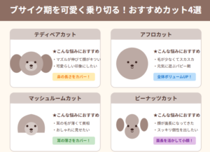 | テディベアカット | マズルが伸びて顔がキツく見える | 鼻の長さをカバーして幼い表情に見せる |