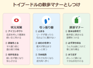 地域の方々に「トイプードルちゃん、いつもお利口だね」と言ってもらえるよう、清潔で気持ちの良い散歩を心がけたいですね。