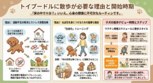 ここでは、なぜトイプードルに散歩が必要なのか、そして子犬を迎えた場合にいつから外に出していいのか、その具体的な理由とタイミングについて詳しく解説していきます。
