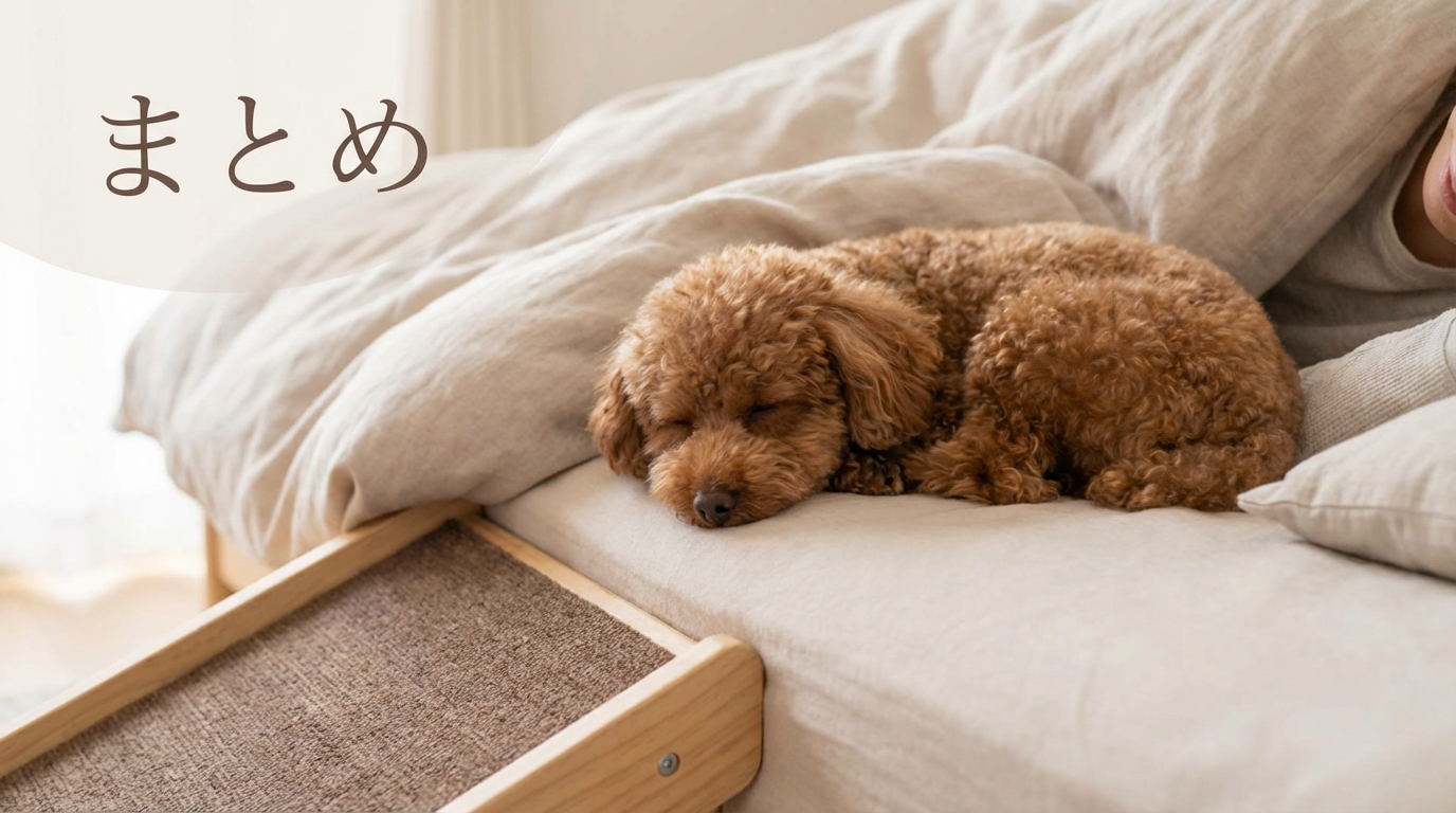 ベッドで一緒に寝るなら、ドッグステップやスロープを設置して、安全な上り下りのルートを確保することが必須です。