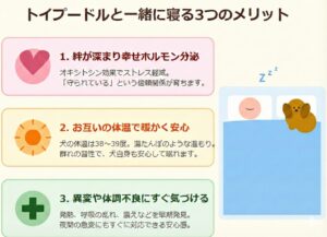 ここでは、実際にトイプードルと暮らす中で感じる、一緒に寝ることの大きなメリットを3つに絞ってご紹介します。